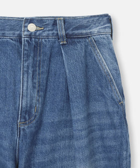 タックデニムワイドテーパーのシルエット。少し裾を折り返してロールさせてローファーやヒールなどとコーディネートするとすっきりとみえますし、そのままのシルエットを楽しんでいただくのもおすすめです。アルアバイル定番のジャケットの外しはもちろん、プリントブラウスなどのフェミニンなアイテムともマッチ。ボリュームのあるシルエットでもすっきりと見せてくれる美脚効果も期待できます。