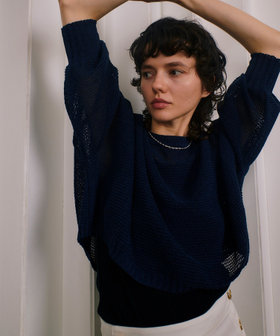 和紙混の涼やかな素材をドロップ天竺というメッシュ状組織に編み上げて、涼やかでざっくりした風合いに仕上げました。