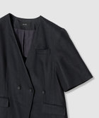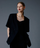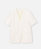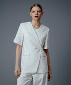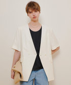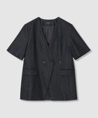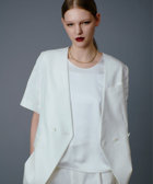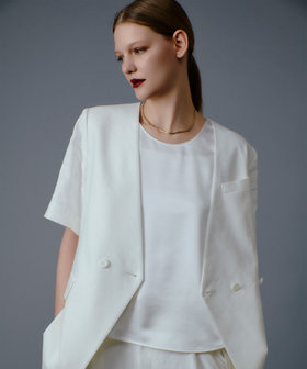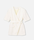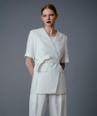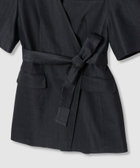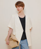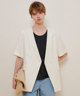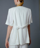 ハーフスリーブで、首元がすっきりとしたミドル丈ジャケットなので、Tシャツやサテンのような光沢素材のインナーに、デニムなどのカジュアルなボトムスとの羽織との相性がよく、共布ベルトが付属で付いているので、ウエストマークしたスタイリングもおすすめです。