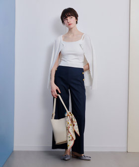 普通にインをキャミソールにしてアンサンブルとして着ても良いですが、今シーズンは、カーディガンの上にベスト風に重ねるのがトレンドです。