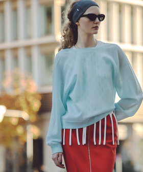 インナーにロゴアイテムを着て透けさせるのもおすすめ。