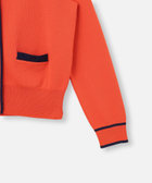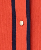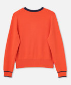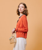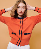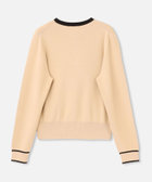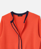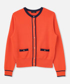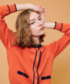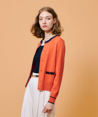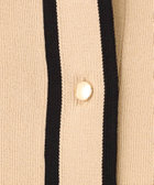 バイカラー切り替えと、メタルボタンがアクセントになったクルーネックカーディガン。