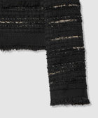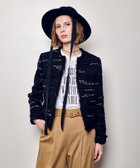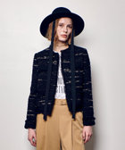 ポケット口や裾口に同色フリンジとテープリボンを施し、立体感のある表情に仕上げた、ノーカラーのツイードジャケット。