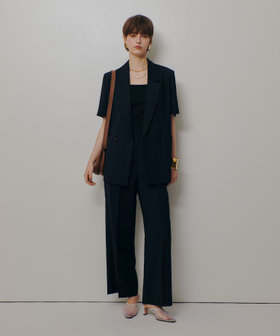 肌触りのしなやかなサマーウールで仕立てた美シルエットのストライプパンツ。ベルト上から続くタックで腰回りのラインをスッキリと見せ、釦でポイントを作っています。また、脇ファスナー仕様なので前部分もスッキリとさせてマニッシュさと女性らしいエレガントさを兼ね備えたお作りにしています。皺になりづらい素材なのでオフィスでも活躍できる一枚です。同素材でお作りしているハーフジャケットと合わせて楽しんで頂くことも出来ますし、様々なトップスと合わせやすいシルエットになっております。