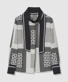ラインを効かせたスカーフを巻いたようなデザインの幾何学柄のブラウスです。