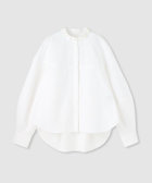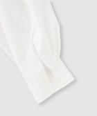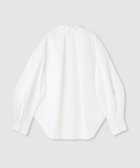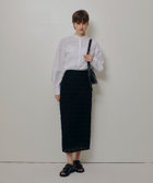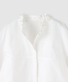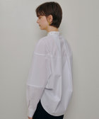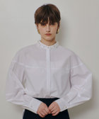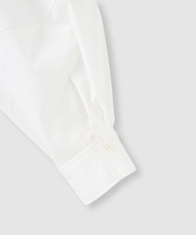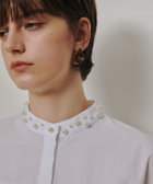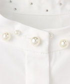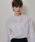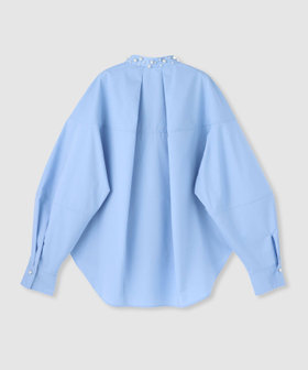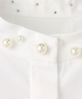 パールとボリュームスリーブのフェミニンさとシャツ素材のマニッシュさの組み合わせが大人可愛いテイストに。