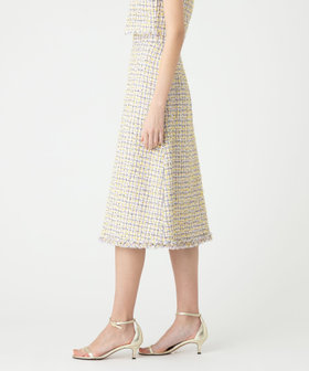 LINTON(リントン)社のツィードを使用したツィードスカート。今回はイエローとホワイトの衣装糸の色が春らしいファンシーツィードをチョイス。シンプルなAラインのシルエットに仕上げました。裾にフリンジを施して足元を華やかに演出してくれます。単品でももちろん華やかなアイテムですが、同素材のファンシーツィードジャケットやファンシーツィードビスチェと合わせてコーディネートするのがおすすめです。