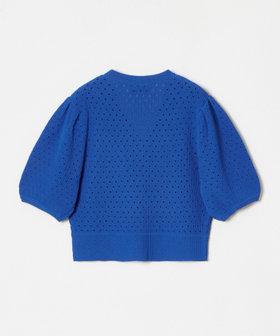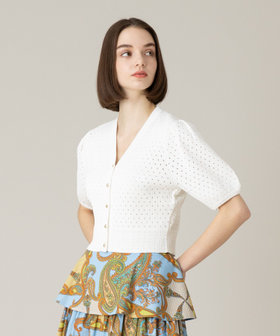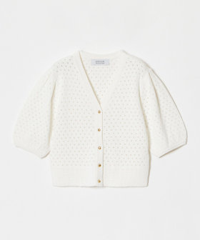 しっかりと編まれた中にアイレットを忍ばせた、レーシーだけど程よい厚みのカーディガン。