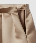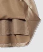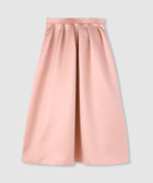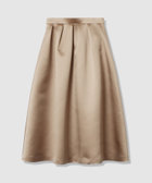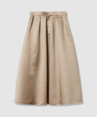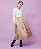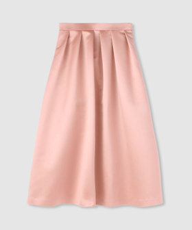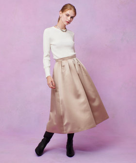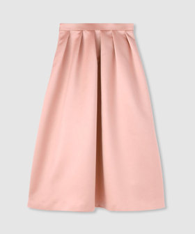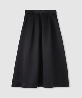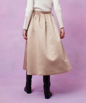 厚手のサテンを使用。光りすぎない上品な光沢のサテン生地です。しっかりした生地にさらに全面芯を貼って、タックのラインが美しく出るように工夫しております。シンプルなタックスカートですが、タックの分量や全体のシルエットに拘った一着。冬時期の毛足のあるTopsなどと高相性のスカートです。