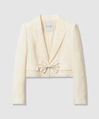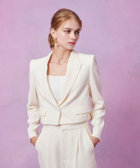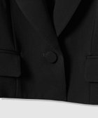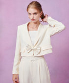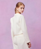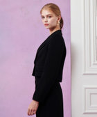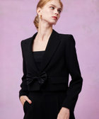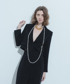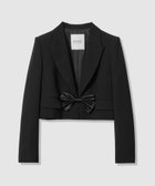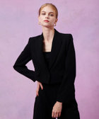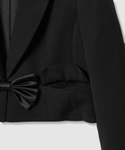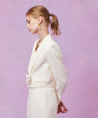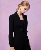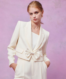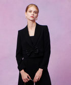 トリアセ混のキレイめでモード感のあるダブルクロス素材を使用。短めの丈にシャープなピークドラペル、コンケープさせた肩のラインがやや強めな印象です。(コンケープドショルダー:肩のラインが湾曲し肩先が上にツンと立ち上っているラインに特徴があります。)そんなモードな印象のJKに取り外し可能なリボンをフロントにセットしてLOULOUらしいJKに仕上げています。リボン以外に共布でくるんだつづみ釦もセットでお作りしておりますので、お好みで付け替えて頂けます。同素材のPTとセットアップでもお勧めです。