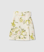 イタリアのRATTY社のテキスタイルを使用、フレッシュなレモン柄をグログラン素材にプリントしています張り感と適度な張り感が特徴。トレンドのミニのラップスカート、ウエストのシルバーメタルボタン爽やかさを際立たたせます。裏地のライムカラーもルルならでは!同素材のコートとのコーディネイトで更に印象的に。