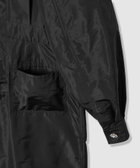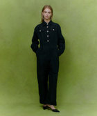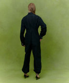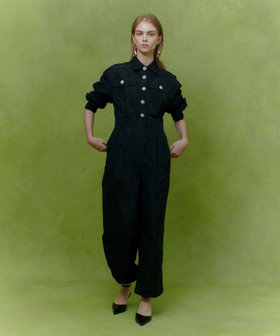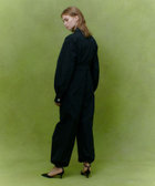 イタリアのETIQUE社のタフタを使用しています。微光沢と適度な張り感が特徴。ビジュービジューボタンが可愛い微光沢のタフタのオールインワンです。折伏せ縫いという拘りの仕様で縫い上げた為裏側の美しく、太い番手でSTを入れることで表情感を作り出しています。カジュアルにも、フォーマルにも着ていただけるスペシャルな1着。上半身を脱いで袖をウエストで縛って着ていただくのもお勧めです。パンツのすそを絞ってシルエットの変化を楽しめます。