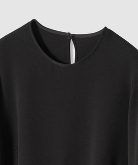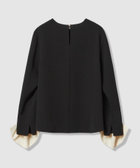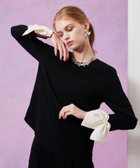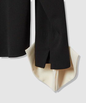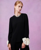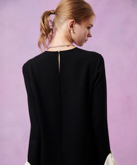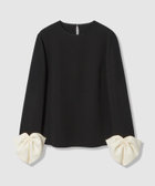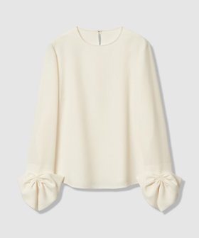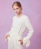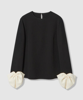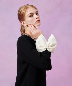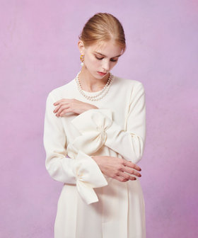 トリアセ混のキレイめでモード感のあるダブルクロス素材を使用。袖口には大きなリボンが装飾されており、手元を華やかに演出してくれます。その分身頃はシンプルなデザインに。袖はほっそり見えるように仕立てております。身頃がBKにはリボンをアイボリーの配色にしています。身頃アイボリーには同色のリボンが付きます。
