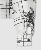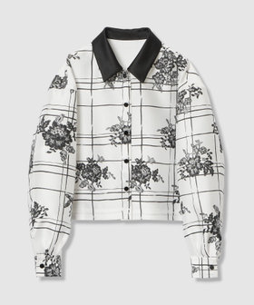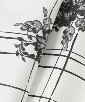 イタリアのコモにあるSilk-co(シルク コー)社のインポート生地。張りと美しい艶のあるハードめな素材にモノトーンの格子とレースのお花が繊細に描かれています。ホワイト&ブラックの配色でクリアな印象。