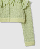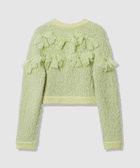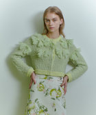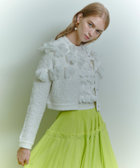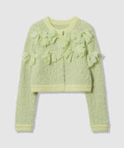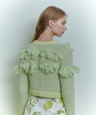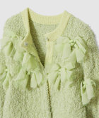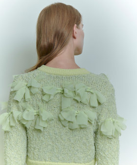 花びらのような(petal:ペタル)リボンをちりばめた今期にぴったりのニットカーディガン。身頃はコットン糸とチュールヤーンを組み合わせたツィードのような立体的な編地。リボンのジョーゼット生地はペタルパピヨンPOと同素材で、オフとクロはアンサンブルで着ていただけます。カーディガンは綺麗なライムグリーンを差し色にしています。
