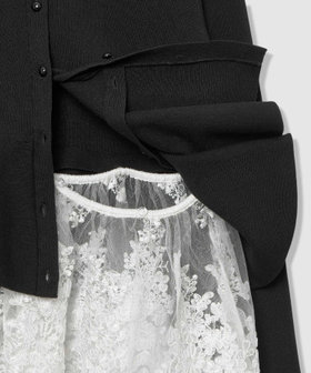 ペプラムのニットに取り外し可能なレースがついた便利で華やかなプルオーバー。