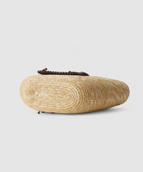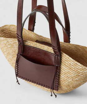 エイジングが楽しめるレザーポケットがフロントに付いた舟形のカゴバッグ。